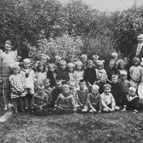 Meester Blanken en juffrouw Ekhart met 'hun' kinderen.